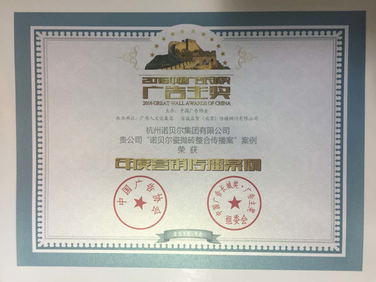 2016年10月23日下午,“2016广告长城奖·广告主奖”颁奖盛典在海南国际会展中心隆重举行。经过严格筛选,激烈角逐后,诺贝尔集团最终脱颖而出,诺贝尔瓷抛砖整合传播案获得“广告长城奖广告主奖·年度营销传播案例”奖,集团营销副总裁宋杭祥荣获“广告长城奖·年度品牌贡献人物”,一举荣膺两项被誉为广告界“奥斯卡”的实力大奖,闪耀全场。