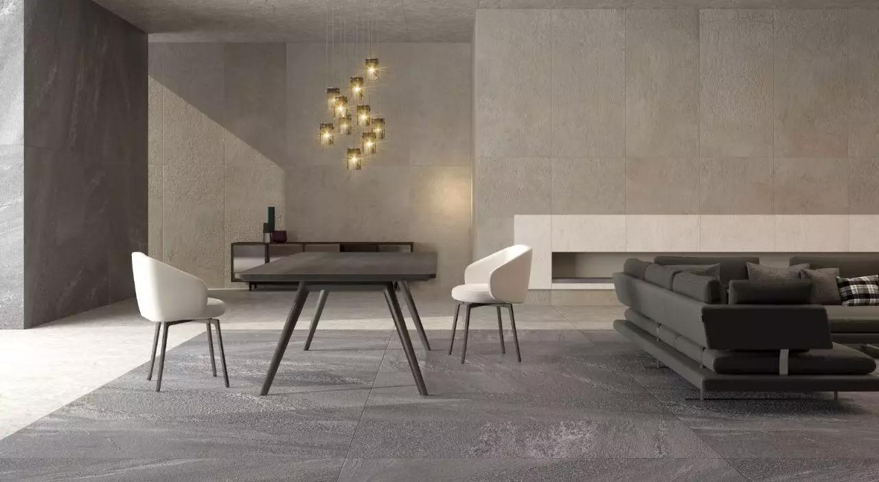 ▲诺贝尔大板瓷抛砖安哥拉灰与莎安娜、银貂灰搭配出的餐厅空间