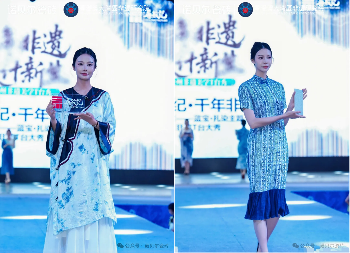 当晚的“寻纹纪·千年非遗”主题T台大秀,将整场活动推向互动高潮。15位专业模特身着以传统蓝染扎染技艺为灵感的高级定制服饰翩然登场,手中持有的则是融合了各色纹样的诺贝尔系列岩板产品。
